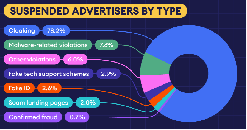 Cloaking 占據(jù)賬戶暫停的主導(dǎo)地位,超過 80% 的確認(rèn)案例與此相關(guān)。其本質(zhì)是向?qū)徍讼到y(tǒng)與終端用戶展示不同內(nèi)容,以規(guī)避規(guī)則和審查。