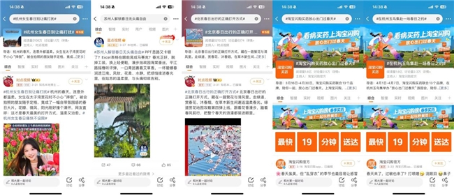 第三輪,#在杭州玉鳥集赴一場(chǎng)春日之約# 配合淘寶閃購買藥快閃活動(dòng)上線。這個(gè)話題詞幾乎“去品牌化”,完全從場(chǎng)景切入。用戶發(fā)打卡照帶這個(gè)話題,像是在分享周末生活,品牌信息藏在體驗(yàn)里。