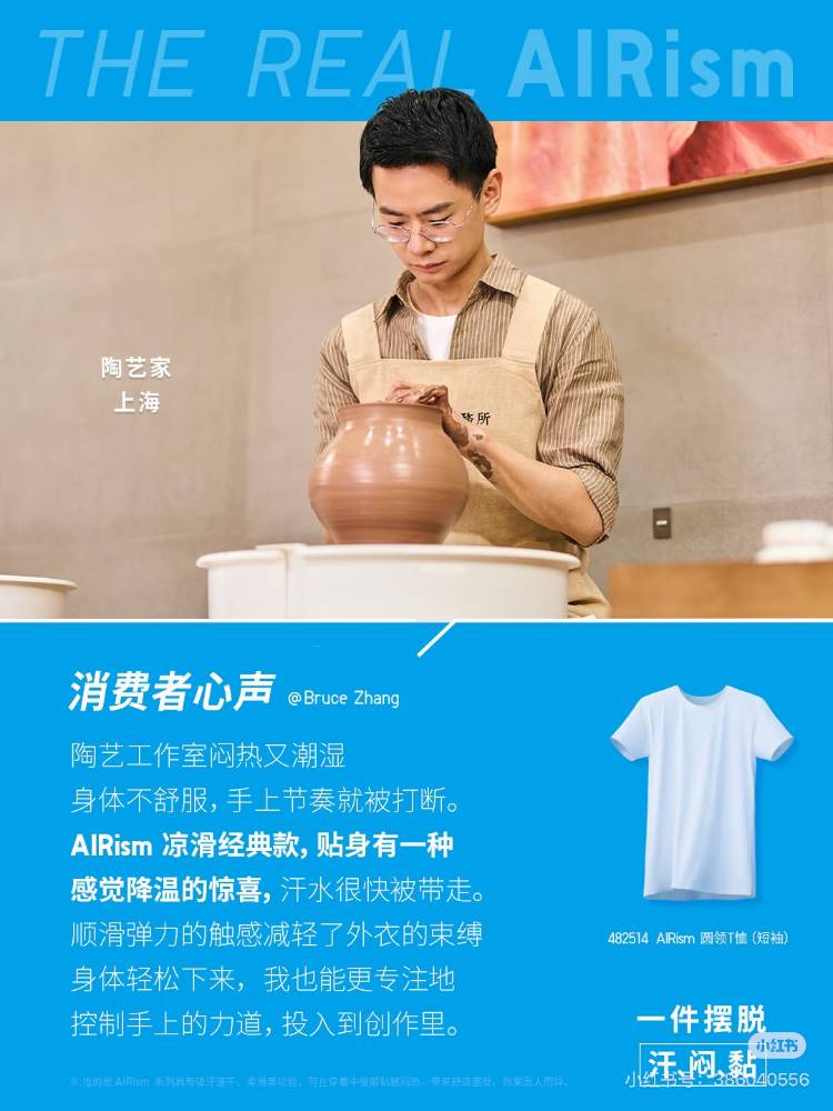 抖音刷到一個(gè)高贊視頻,博主表達(dá)了對(duì)優(yōu)衣庫(kù)廣告的好感。 畫面上的京劇演員貼身穿著優(yōu)衣庫(kù)T恤,外面是層疊厚重的戲服,不需要太多的文案,吸濕的產(chǎn)品賣點(diǎn)就立住了。 搜了下這系列海報(bào),優(yōu)衣庫(kù)還找了牙醫(yī)、主廚、陶藝家、大排檔主理人、植物店店主等長(zhǎng)期需要在高溫潮濕環(huán)境里工作的普通人。 這些人都不是標(biāo)準(zhǔn)意義上的KOL,而是各自領(lǐng)域里有手藝、有尊嚴(yán)感的勞動(dòng)者。這說明了,產(chǎn)品功能是服務(wù)于真實(shí)的、具體的、正在勞動(dòng)中的人的,而不是服務(wù)于一個(gè)想象中的生活方式。