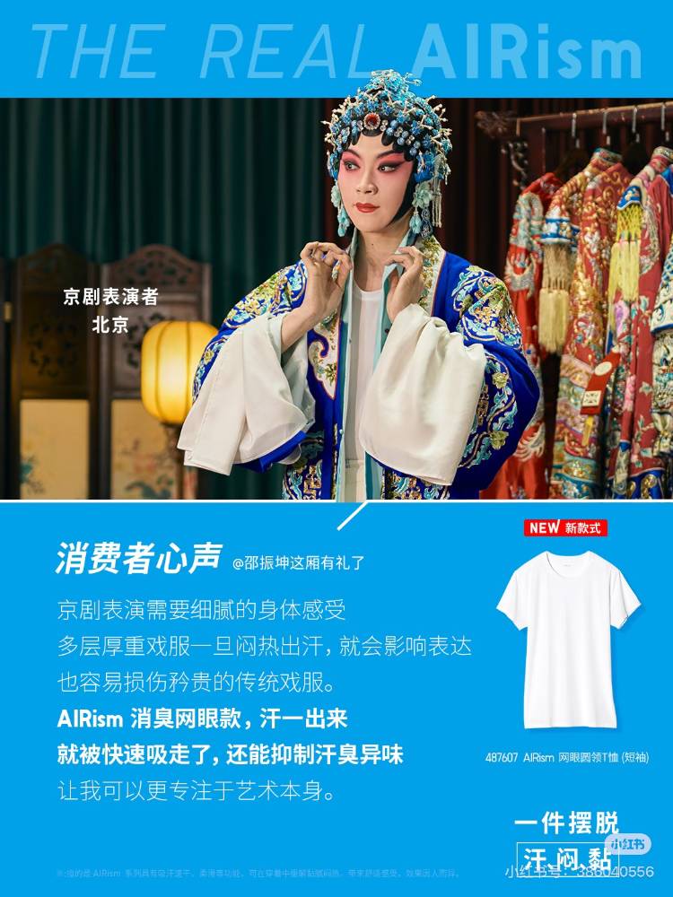 抖音刷到一個(gè)高贊視頻,博主表達(dá)了對優(yōu)衣庫廣告的好感。 畫面上的京劇演員貼身穿著優(yōu)衣庫T恤,外面是層疊厚重的戲服,不需要太多的文案,吸濕的產(chǎn)品賣點(diǎn)就立住了。 搜了下這系列海報(bào),優(yōu)衣庫還找了牙醫(yī)、主廚、陶藝家、大排檔主理人、植物店店主等長期需要在高溫潮濕環(huán)境里工作的普通人。 這些人都不是標(biāo)準(zhǔn)意義上的KOL,而是各自領(lǐng)域里有手藝、有尊嚴(yán)感的勞動(dòng)者。這說明了,產(chǎn)品功能是服務(wù)于真實(shí)的、具體的、正在勞動(dòng)中的人的,而不是服務(wù)于一個(gè)想象中的生活方式。